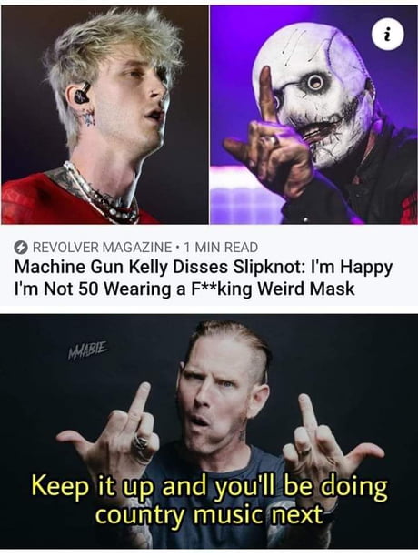 Machine Gun Kelly tried to start beef with rock band Slipknot at Riot Fest dissing the band for being 50 years old wearing a fuckin weird mask on a. For a while there it looked as though the feud between Machine Gun Kelly and Slipknot had finally ended but Slipknot band member Corey Taylor recently proved that wasnt the case dissing MGK in a recent appearance. Machine Gun Kelly Tries to Diss Metal Band Slipknot Gets Dragged.